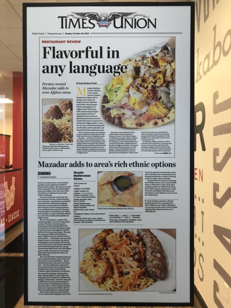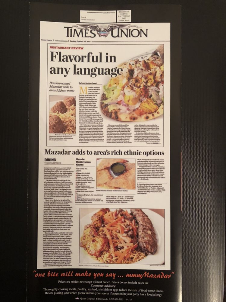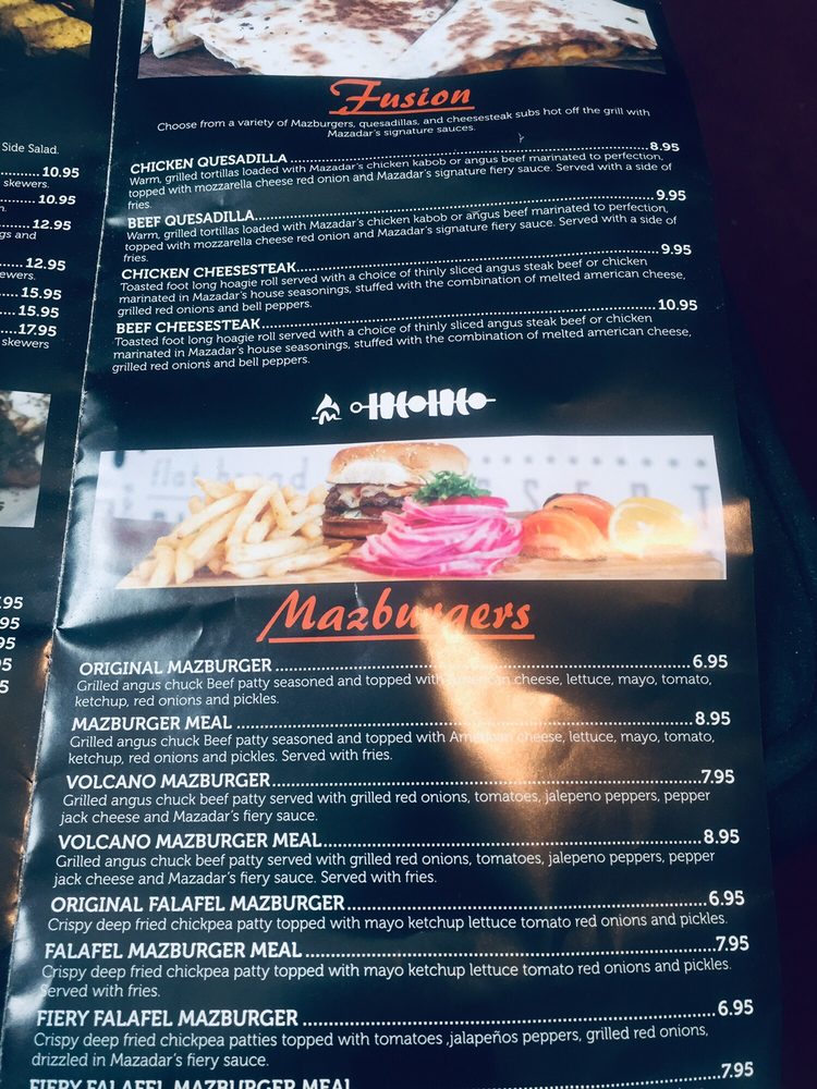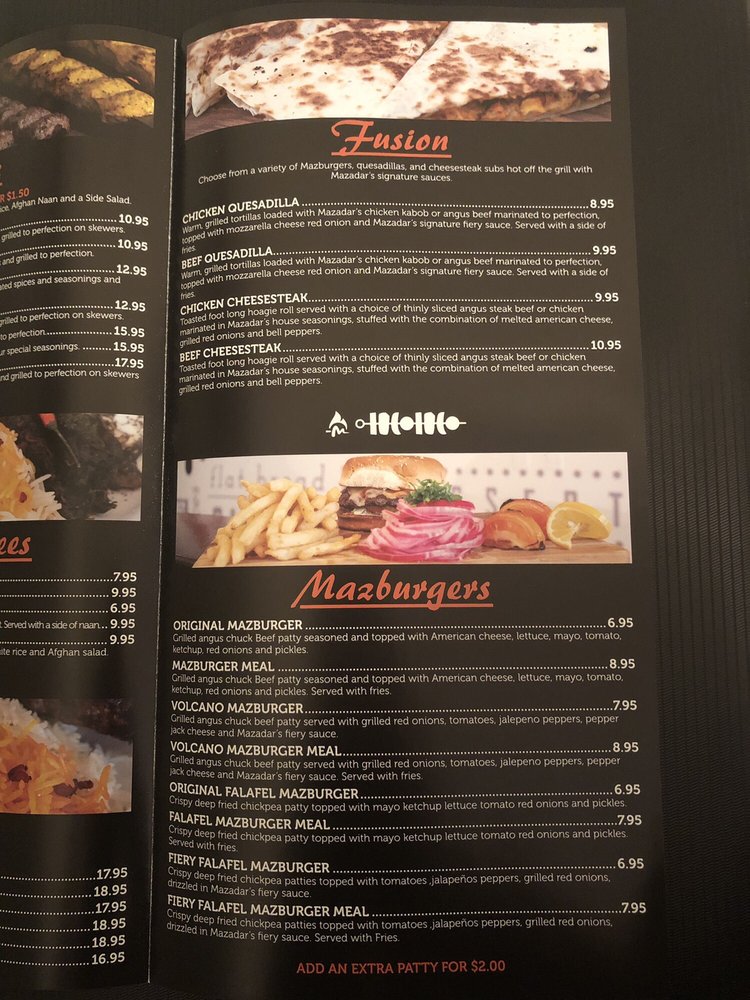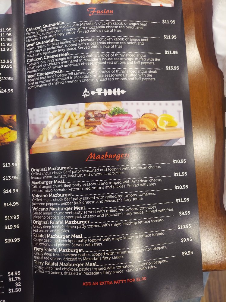 Mazadar Mediterranean Kitchen in Albany, NY offers a diverse menu of Mediterranean and Halal cuisine. Their appetizers feature unique dishes like Mantu Dumplings, Bolani Flatbread, and Banjan Borani. For salads, they offer options like Chicken Kabob Salad and Chicken Kofta Kabob Salad with marinated chicken and lamb. The kabob platters include Chicken and Beef Kofta options, served with seasoned rice, salad, and Afghan naan. Customers rave about the flavorful dishes and generous portions, with reviews mentioning dishes like the falafel burger, lamb wrap, and gyro. The atmosphere is described as clean and bright, and the friendly service adds to the overall dining experience. Mazadar Mediterranean Kitchen is a must-visit for those looking for delicious Mediterranean cuisine in a casual setting.